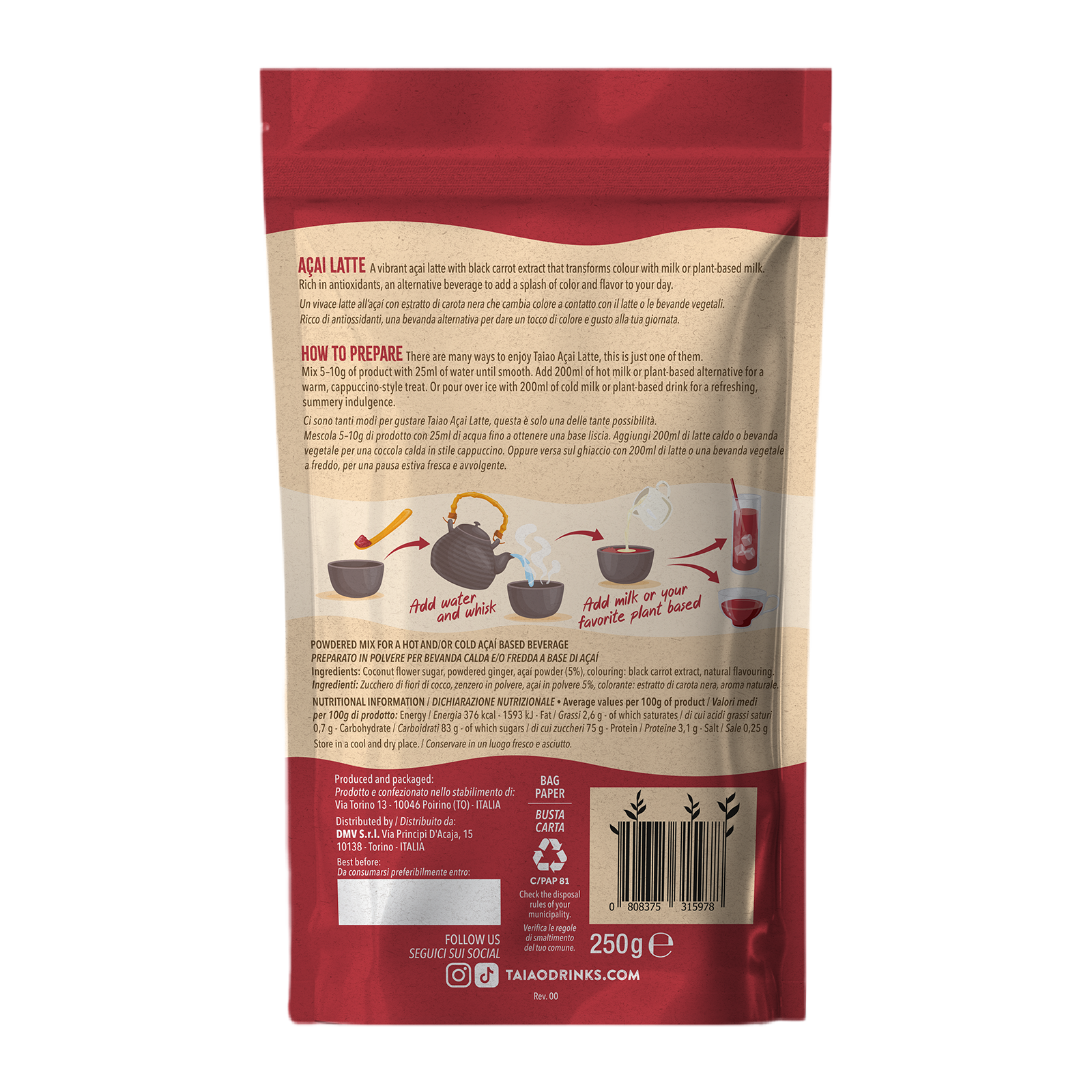 A vibrant acai latte with black carrot extract that transforms colour with milk or plant-based milk. Rich in antioxidants and naturally caffeine-free, it’s a beautiful, nourishing ritual in every sip.